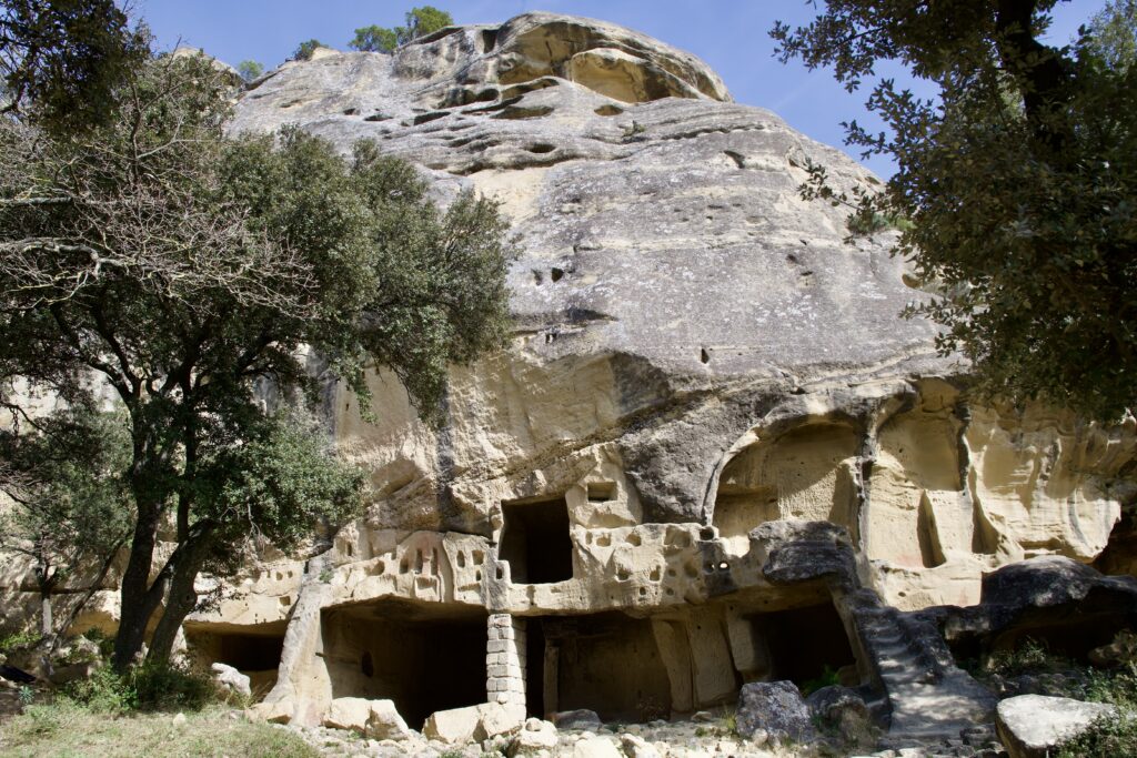 Dans les Alpilles, Calès témoigne d’une occupation civile et communautaire. Creusé dans un cirque de safre, le site compte 58 habitations réparties sur plusieurs niveaux, occupées du Moyen Âge jusqu’au XVIᵉ siècle. On y observe des silos rupestres, des rigoles de récupération d’eau et une organisation rationnelle adaptée à la topographie. L’ensemble évoque un habitat groupé naturellement défendu par la falaise. En savoir plus…